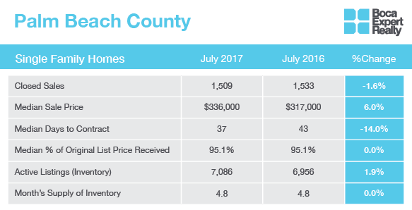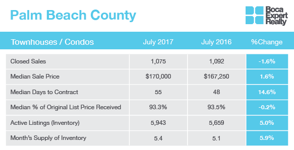 Just like in June, the biggest shifts year-over-year for Palm Beach County’s single family homes market were for median sale price and median days to contract. Though the median sale price rose by 6 percent year-over-year, there was a slight drop month-over-month. This suggests that this market may not be trending toward sellers quite as much as last month. On the other hand, the 14 percent drop in days to contract, coupled with a 9-day reduction month-over-month, is proof that competition is still running high for single family homes. Even with many of the statistics showing a share of power between buyers and sellers, the pressure is on buyers to make qualified offers that stand out.